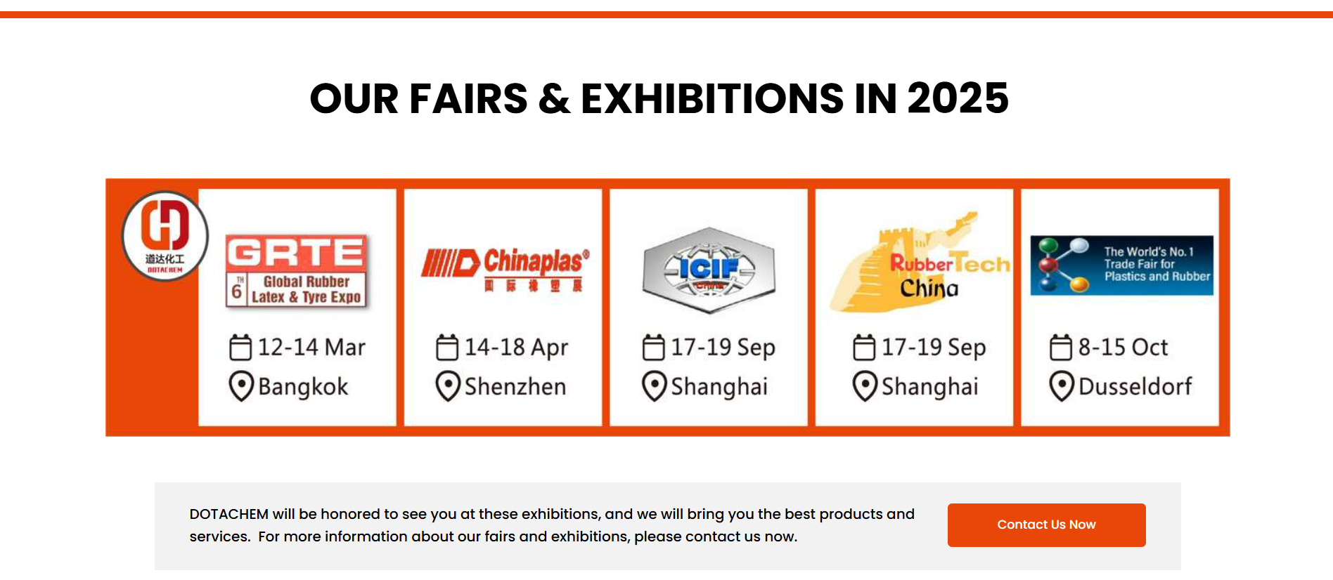 Na výstavě představí Dotachem své vlajkové lodi, včetně speciálních gumových chemikálií, zpracování AIDS a přísad o výkonu, což zdůrazňuje jejich vynikající výkon a příspěvek ke zvýšení kvality a trvanlivosti produktů a pneumatik. Návštěvníci se mohou těšit na zapojení s odborníky na Dotachem, získávání poznatků a podrobností o produktech.