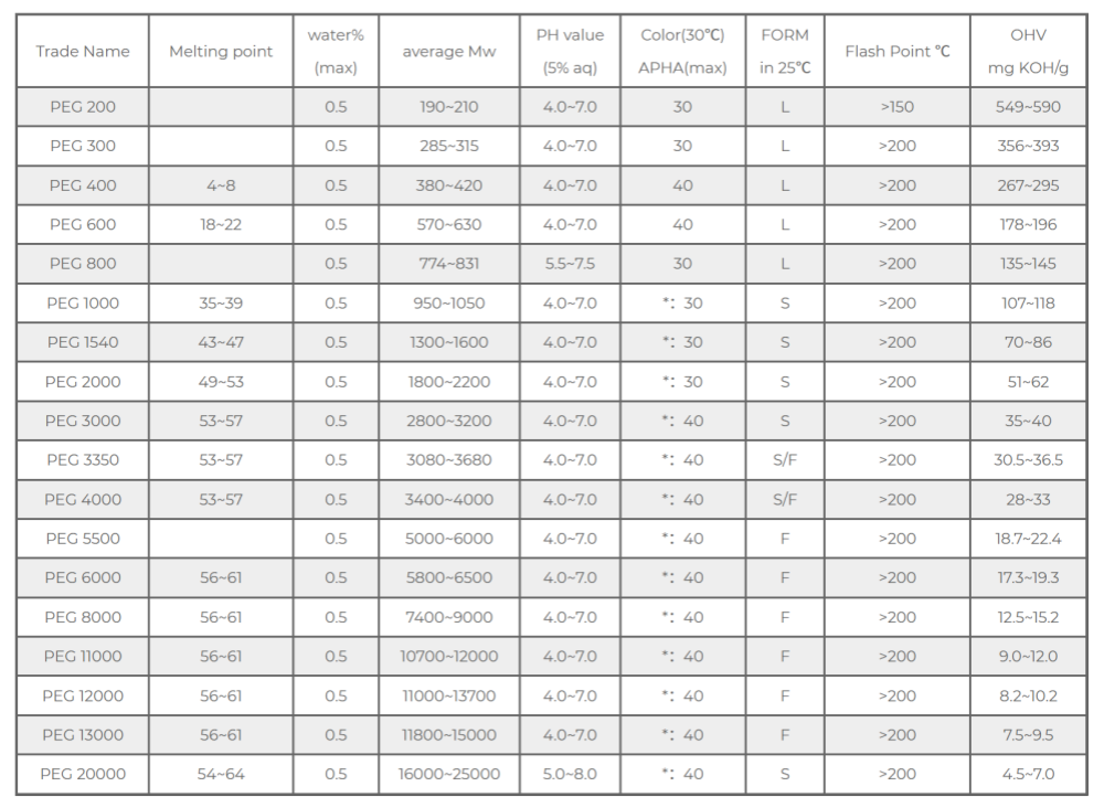 PEG-6000 a vyšší: Vysoká molekulová hmotnost, tvrdá pevná látka. Má vyšší tvrdost a bod tání a běžně se používá jako pomocný prostředek pro zpracování kovů, lubrikant tablet nebo textilní klížidlo, které poskytuje vynikající lubrikační a disperzní účinky.